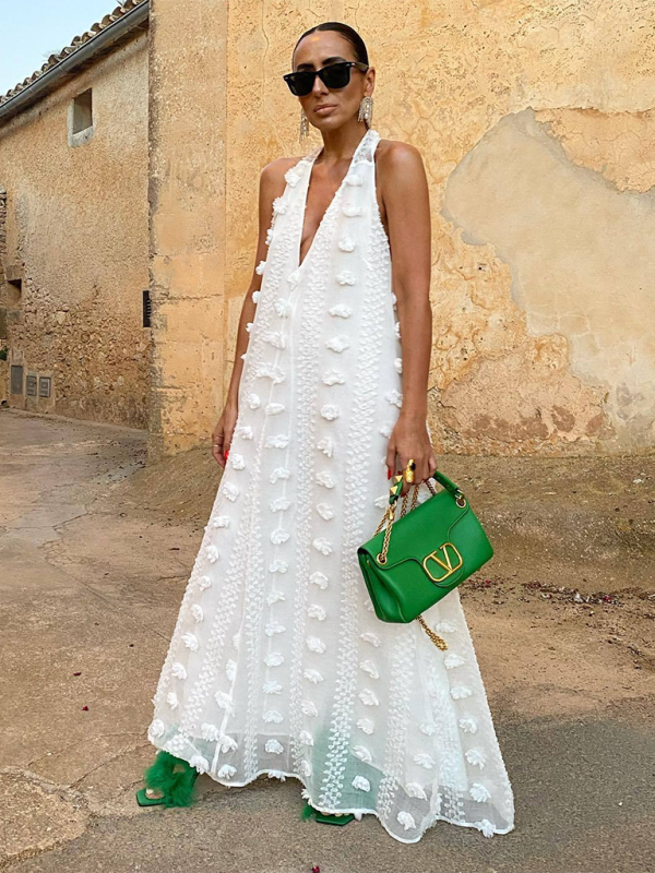 This halter-neck maxi dress with three-dimensional flower appliqués combines romantic charm with luxurious design. The delicate 3D flowers give the dress a sophisticated structure, while the flowing fabric and flattering silhouette ensure a feminine look. Perfect for glamorous events, weddings or stylish summer evenings.