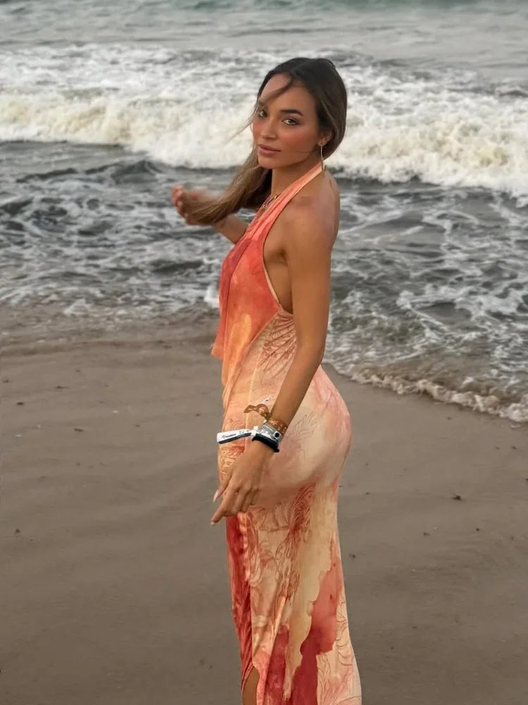 Unleash your bold side in this women's halter backless maxi dress, designed to elevate your beachside glamour. With a deep draped neckline, curve-hugging silhouette, and playful prints, this sleeveless stunner is made for warm evenings, tropical vacations, and spontaneous summer nights out.
